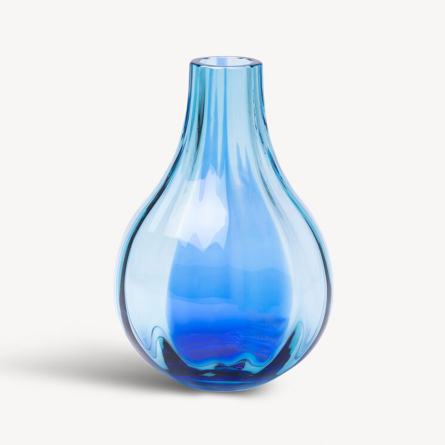 Den dybblå tone fremhæver krystallens klarhed og skaber et smukt lysspil i glasset. Den tidløse form gør vasen lige så smuk med en enkelt blomst som med en større buket, og den fungerer også som et dekorativt designobjekt i sig selv.