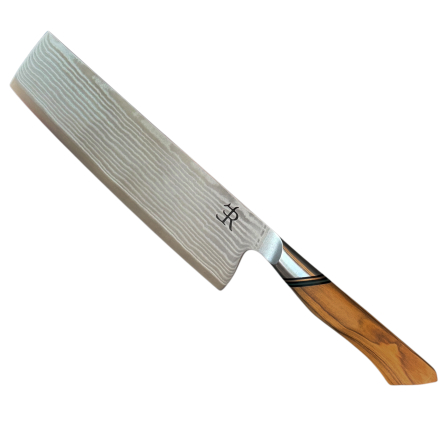 Håndtaget er lavet af mønstret oliventræ, et naturligt og slidstærkt materiale, der giver et ergonomisk greb og et unikt udseende, hvor hver kniv får sin egen karakter.